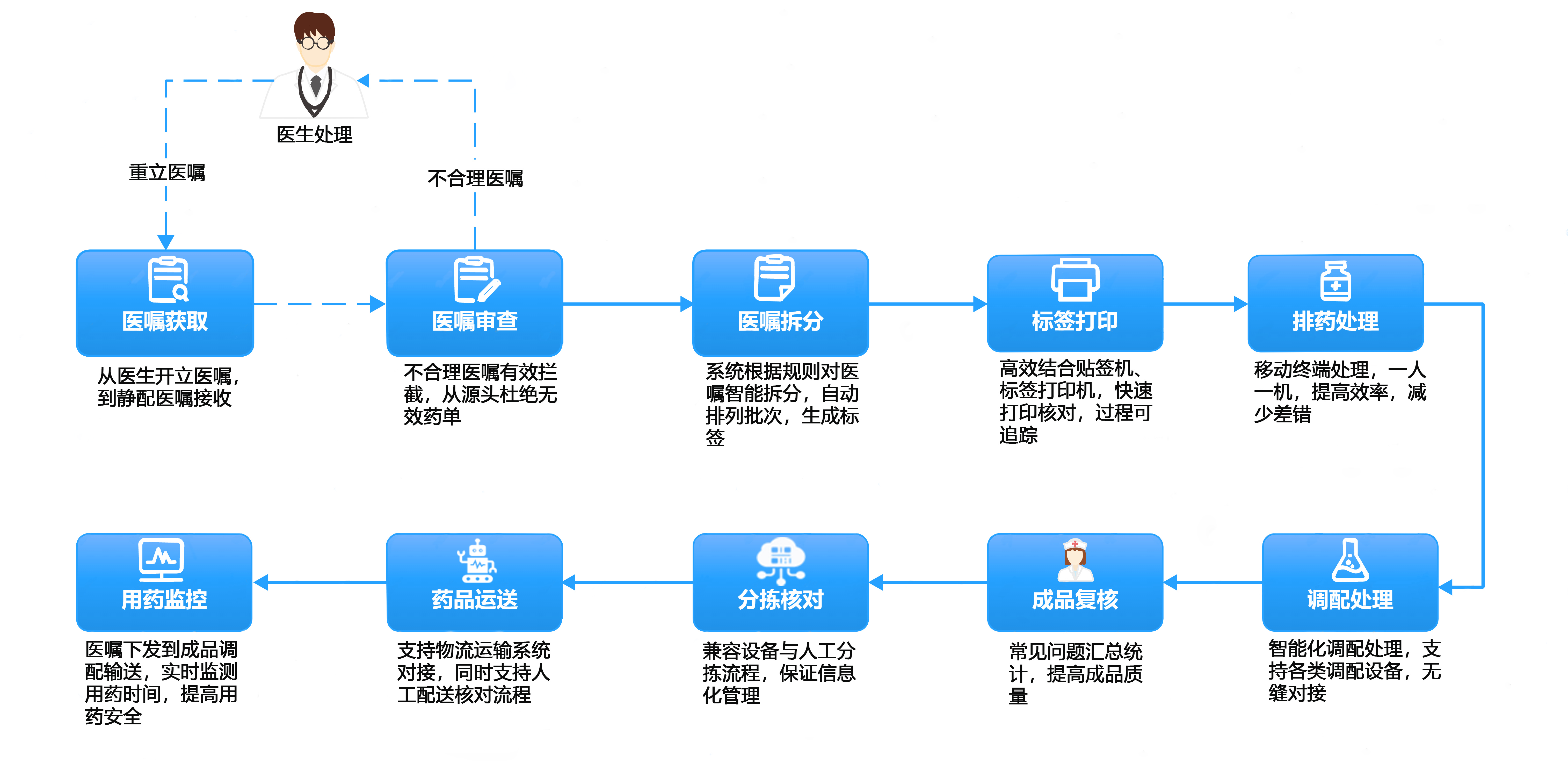 具備醫(yī)囑處理、標(biāo)簽打印、排藥處理、調(diào)配處理、成品復(fù)核、 分揀核對(duì)、藥品運(yùn)輸、用藥監(jiān)